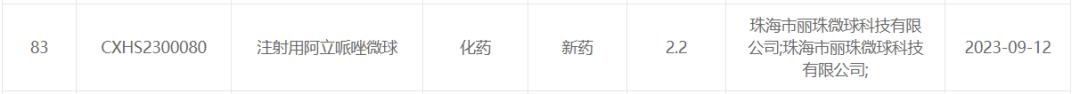 9月12日,中國國家藥監(jiān)局藥品審評(píng)中心(CDE)官網(wǎng)最新公示,麗珠醫(yī)藥全資附屬公司麗珠微球申報(bào)的2.2類新藥注射用阿立哌唑微球上市申請(qǐng)已獲得受理。