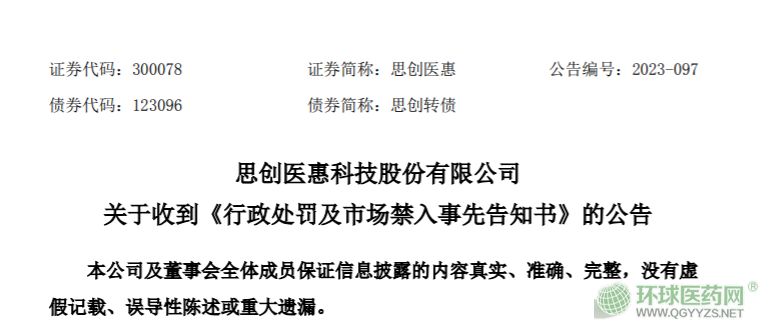 2023年09月26日思創(chuàng)醫(yī)惠發(fā)布公告,因公司存在欺詐發(fā)行違法行為,證監(jiān)會對思創(chuàng)醫(yī)惠科技股份有限公司處以8570萬元罰款,公司多名高管同時被處罰,董事長(總經(jīng)理)被禁業(yè)10年。