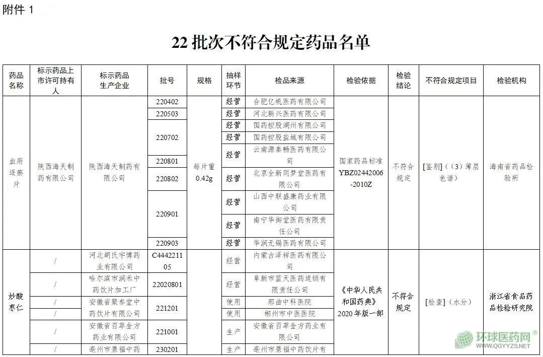 經(jīng)海南省藥品檢驗(yàn)所等5家藥品檢驗(yàn)機(jī)構(gòu)檢驗(yàn),標(biāo)示為陜西海天制藥有限公司等14家企業(yè)生產(chǎn)的血府逐瘀片等22批次藥品不符合規(guī)定,F(xiàn)將相關(guān)情況通告如下:
