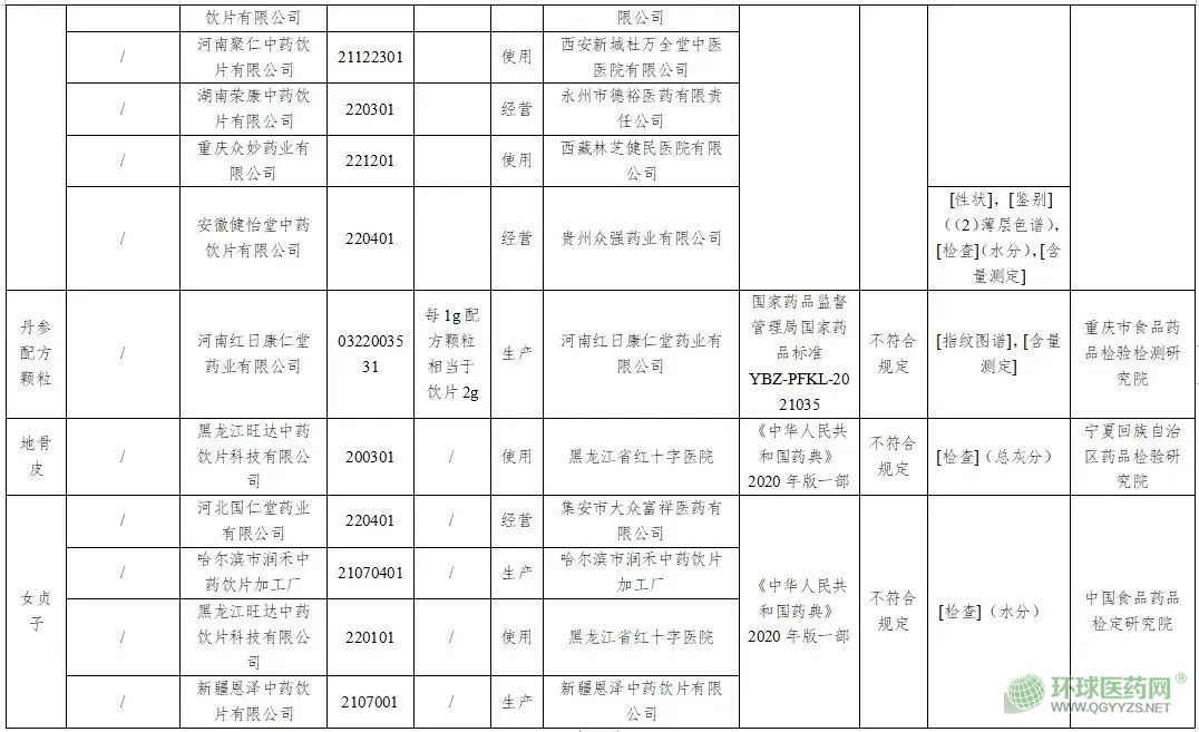 經(jīng)中國(guó)食品藥品檢定研究院檢驗(yàn),標(biāo)示為河北國(guó)仁堂藥業(yè)有限公司、哈爾濱市潤(rùn)禾中藥飲片加工廠、黑龍江旺達(dá)中藥飲片科技有限公司、新疆恩澤中藥飲片有限公司生產(chǎn)的4批次女貞子不符合規(guī)定,不符合規(guī)定項(xiàng)目為水分。