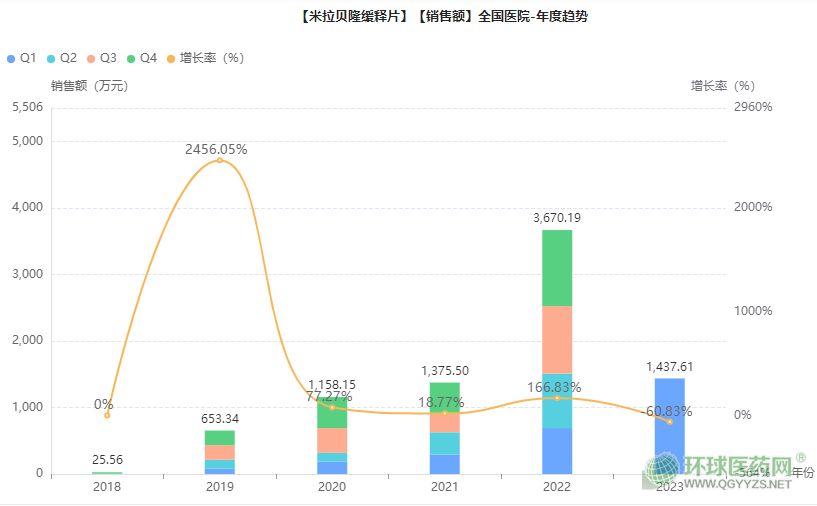 此前OAB治療藥物以抗膽堿能藥物為主,米拉貝隆進(jìn)入國內(nèi)后,格局逐漸發(fā)生改變。根據(jù)藥融云數(shù)據(jù),2018年5月底在中國市場上市后,同年院內(nèi)終端銷售額不到百萬元,2019年開始放量,2020年破1000萬元;2022年銷售額已達(dá)3670萬元,同比大漲166%。2023年單單一個(gè)季度就已經(jīng)超過以往全年成績,達(dá)到了1437萬元。作為一個(gè)剛進(jìn)國內(nèi)市場不久的新型藥物,米拉貝隆還有巨大增長空間。