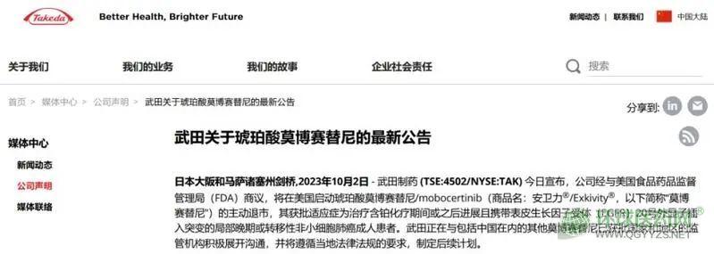 據(jù)悉,就在今年1月11日,琥珀酸莫博賽替尼在中國獲批上市。3月,其在中國開始銷售,零售價(jià)為37588元/盒(40mg*112粒)。武田表示,正在與包括中國在內(nèi)的其他莫博賽替尼已獲批國家和地區(qū)的監(jiān)管機(jī)構(gòu)積極展開溝通,并將遵循當(dāng)?shù)胤煞ㄒ?guī)的要求,制定后續(xù)計(jì)劃。