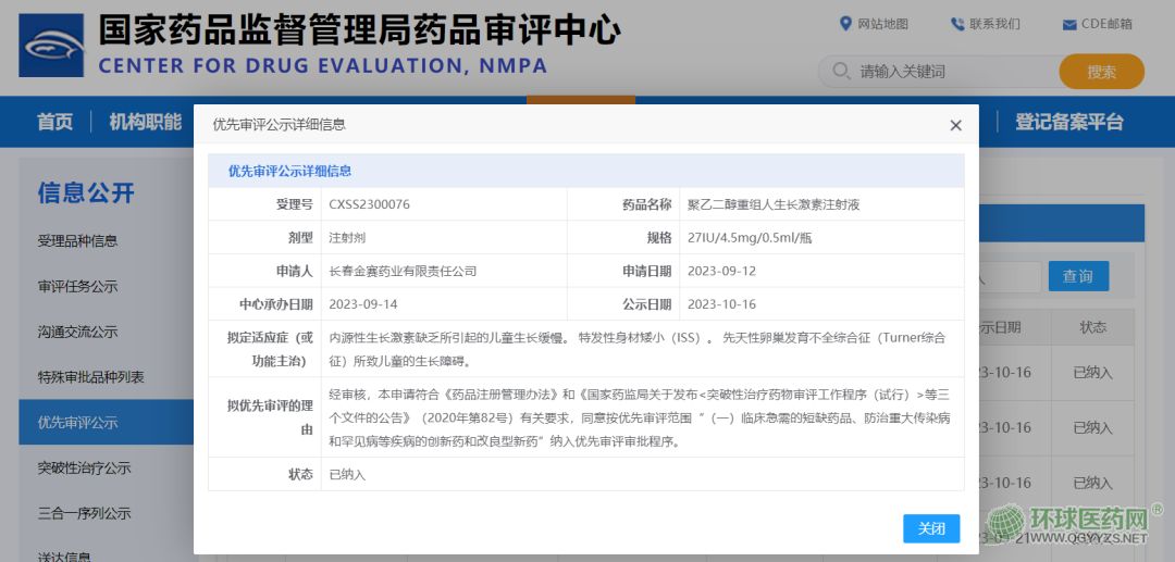 近日,國家藥監(jiān)局藥品審評中心(CDE)官網(wǎng)顯示,長春金賽藥業(yè)的聚乙二醇重組人生長激素注射液(商品名:金賽增)擬納入優(yōu)先審評,規(guī)格為27IU/4.5mg/0.5ml/瓶,適應(yīng)癥為內(nèi)源性生長激素缺乏所引起的兒童生長緩慢,以及特發(fā)性身材矮小(ISS)、先天性卵巢發(fā)育不全綜合征(Turner綜合征)所致的兒童生長障礙。
