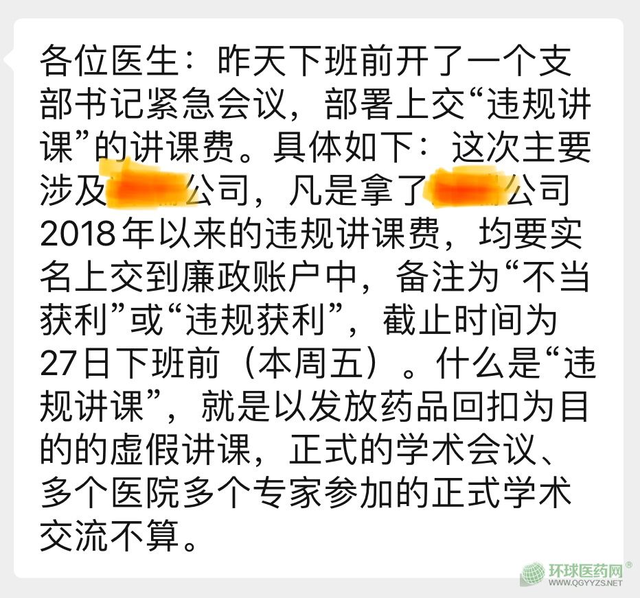 同樣在浙江,另一個地市的某醫(yī)院通知召開緊急會議,會上通報了某公司一份講課費清單到了市紀委手里,涵蓋了該地市各家醫(yī)院,并且具體到了醫(yī)生個人。該醫(yī)院就有醫(yī)生在這份名單上。