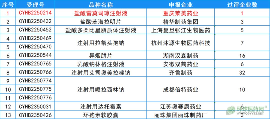 其中,重慶萊美藥業(yè)的鹽酸雷莫司瓊注射液為首家過評,用于預防和治療抗惡性腫瘤治療所引起的惡心、嘔吐等消化道癥狀。鹽酸苯海拉明片和環(huán)孢素軟膠囊迎來第3家。