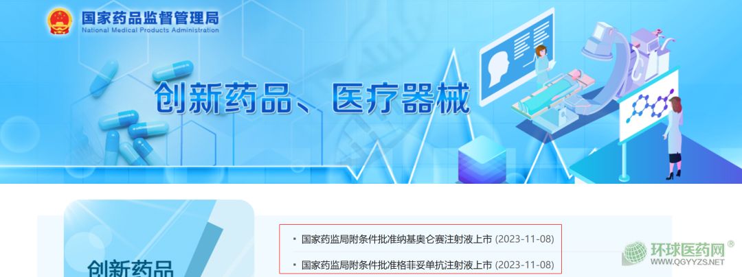 11月8日,據(jù)國(guó)家藥監(jiān)局網(wǎng)站消息,國(guó)家藥監(jiān)局附條件批準(zhǔn)兩款創(chuàng)新藥,分別為羅氏制藥的格菲妥單抗注射液和合源生物的納基奧侖賽注射液。