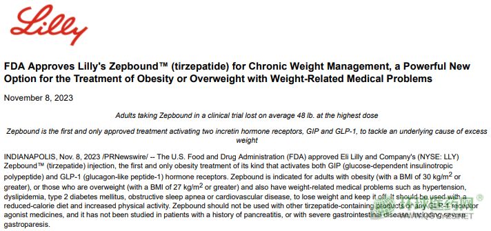 11月8日,美國食品和藥物管理局(FDA)批準禮來公司的重磅藥物替爾泊肽(tirzpatide)用以使肥胖或超重成年患者減輕體重并保持體重穩(wěn)定,且這些患者患有體重相關共病,包含高血壓、血脂異常、2型糖尿病、阻塞性睡眠呼吸暫;蛐难芗膊