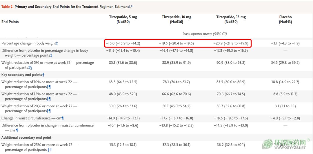 針對肥胖或超重伴2型糖尿病患者的SURMOUNT-2研究結果顯示,10mg劑量組平均體重減輕13.4%,15mg劑量組受試者平均體重減輕15.7%,顯著優(yōu)于安慰劑組。