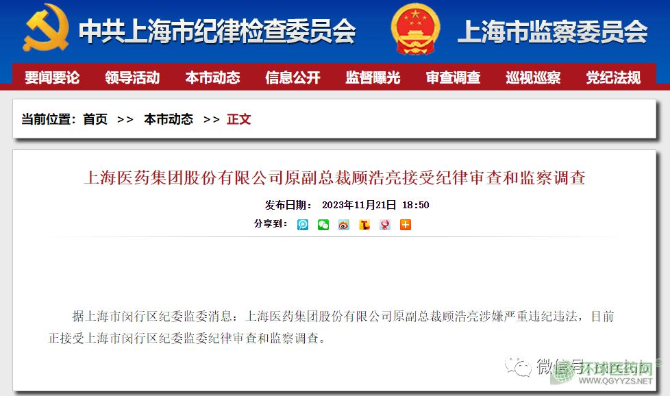 據(jù)上海紀(jì)檢監(jiān)察網(wǎng),上海醫(yī)藥集團(tuán)股份有限公司原副總裁顧浩亮涉嫌嚴(yán)重違紀(jì)違法,目前正接受上海市閔行區(qū)紀(jì)委監(jiān)委紀(jì)律審查和監(jiān)察調(diào)查。