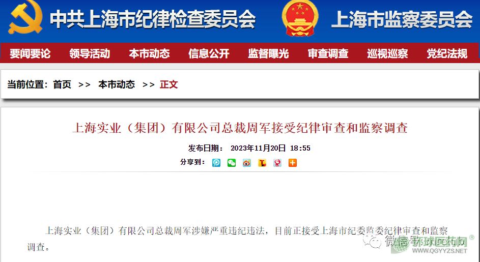 昨日,據(jù)上海紀(jì)檢監(jiān)察網(wǎng),上海實(shí)業(yè)(集團(tuán))有限公司總裁周軍涉嫌嚴(yán)重違紀(jì)違法,目前正接受上海市紀(jì)委監(jiān)委紀(jì)律審查和監(jiān)察調(diào)查。