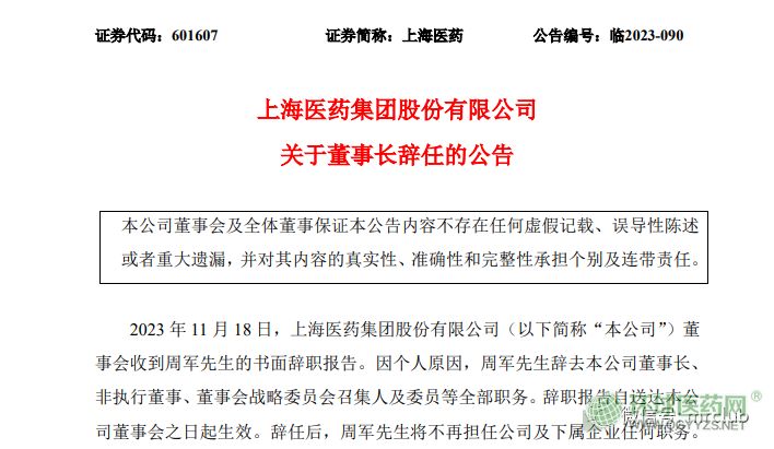據(jù)昨日上海醫(yī)藥集團(tuán)股份有限公司公告,2023 年 11 月 18 日,上海醫(yī)藥集團(tuán)股份有限公司董事會(huì)收到周軍的書(shū)面辭職報(bào)告。因個(gè)人原因,周軍辭去本公司董事長(zhǎng)、非執(zhí)行董事、董事會(huì)戰(zhàn)略委員會(huì)召集人及委員等全部職務(wù)。辭職報(bào)告自送達(dá)公司董事會(huì)之日起生效。辭任后,周軍先生將不再擔(dān)任公司及下屬企業(yè)任何職務(wù)。
