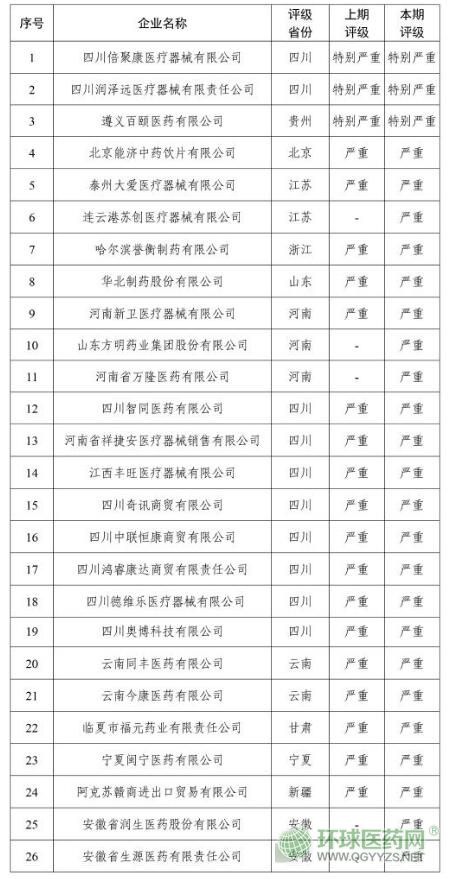值得注意的是,華北制藥、譽衡藥業(yè)上期評級和本期評級均為“嚴重”失信。四川倍聚康醫(yī)療器械有限公司、四川潤澤遠醫(yī)療器械有限責任公司、遵義百頤醫(yī)藥有限公司連續(xù)兩期被評為“特別嚴重”失信。