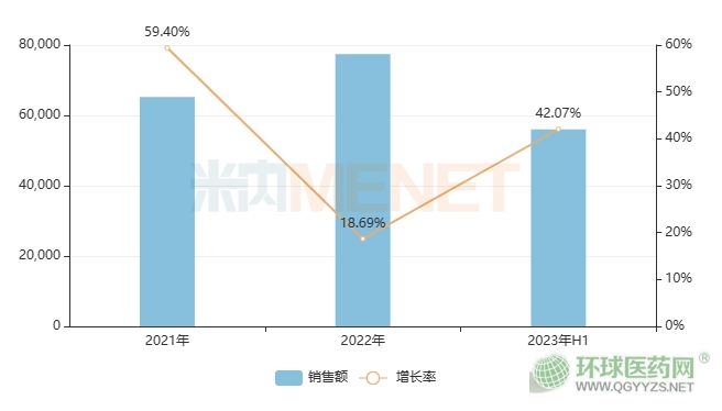 2018年2月,阿柏西普獲NMPA批準(zhǔn)在中國(guó)上市,商品名為艾力雅。2019年通過(guò)談判納入全國(guó)醫(yī)保乙類(lèi)目錄。米內(nèi)網(wǎng)數(shù)據(jù)顯示,阿柏西普被納入醫(yī)保后銷(xiāo)售額立即突破億元,2020-2022年增速分別為106.52%、59.40%、18.69%,2022年銷(xiāo)售額達(dá)7.7億元。2023年上半年增長(zhǎng)率為42.07%,銷(xiāo)售額為5.6億元,在國(guó)內(nèi)已經(jīng)成為眼科用藥TOP3。
