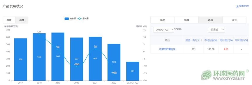 右雷佐生近年在國內(nèi)銷售規(guī)模比較穩(wěn)定。根據(jù)中康開思數(shù)據(jù)庫,2022年等級(jí)醫(yī)院右雷佐生終端銷售額5.09億元,2023Q1-Q2銷售額已達(dá)2.61億元。