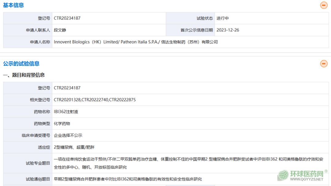 12月26日,CDE藥物臨床試驗(yàn)登記與信息公示平臺(tái)顯示,信達(dá)生物啟動(dòng)了 GLP-1R/GCGR 激動(dòng)劑瑪仕度肽(IBI362)頭對(duì)頭司美格魯肽III期臨床試驗(yàn)(登記號(hào):CTR20234187)。