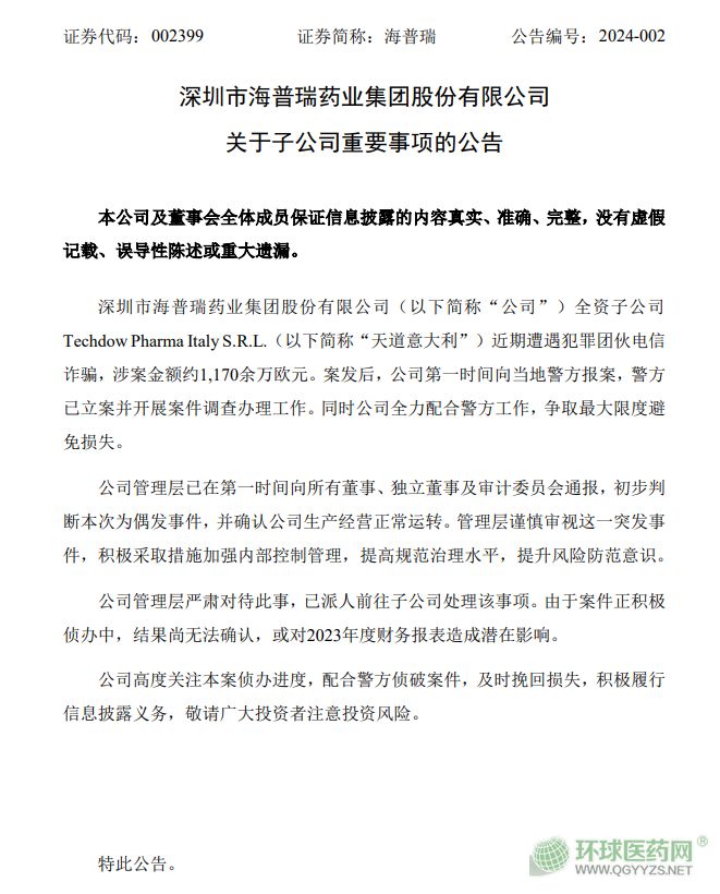 近日,國內(nèi)知名藥企海普瑞發(fā)布公告稱,其全資子公司Techdow Pharma Italy S.R.L.(簡稱“天道意大利”)遭遇犯罪團(tuán)伙電信詐騙,涉案金額1170余萬歐元(按照1月12日匯率,約人民幣9180萬元)。