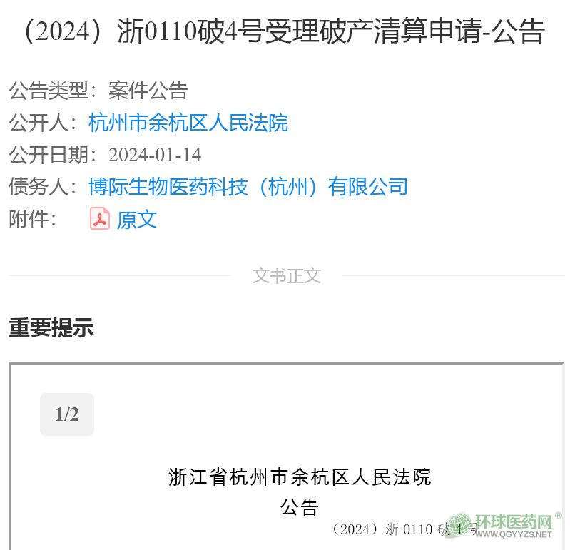 2024年1月12日,浙江省杭州市余杭區(qū)人民法院披露博際生物醫(yī)藥破產(chǎn)案件辦理進(jìn)度。