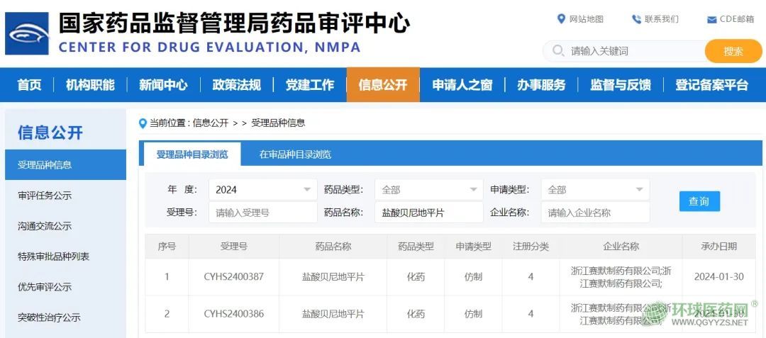 1月30日,國家藥品監(jiān)督管理局藥品審評中心(CDE)官網(wǎng)顯示,浙江賽默制藥按仿制4類提交的鹽酸貝尼地平片上市申請獲CDE承辦受理。