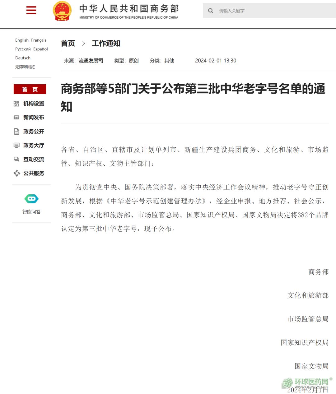 2024年2月1日,商務(wù)部、文化和旅游部、市場(chǎng)監(jiān)管總局、國(guó)家知識(shí)產(chǎn)權(quán)局、國(guó)家文物局五個(gè)部門公布第三批中華老字號(hào)名單。