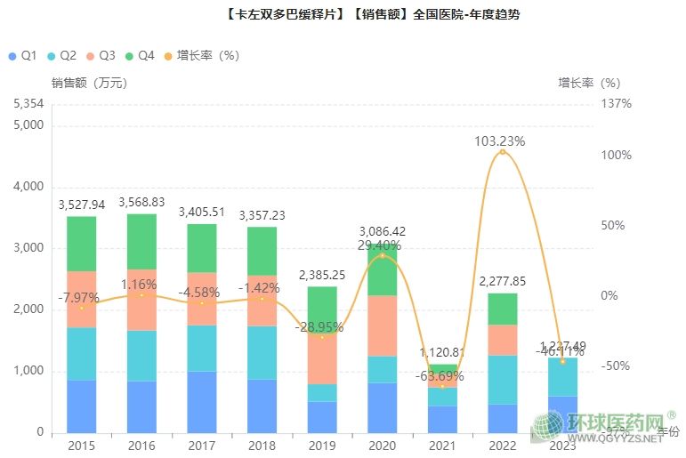 據(jù)藥融云數(shù)據(jù)顯示,2022年卡左雙多巴緩釋片在全國院內(nèi)銷售額超過2200萬,同比增達(dá)103.23%。