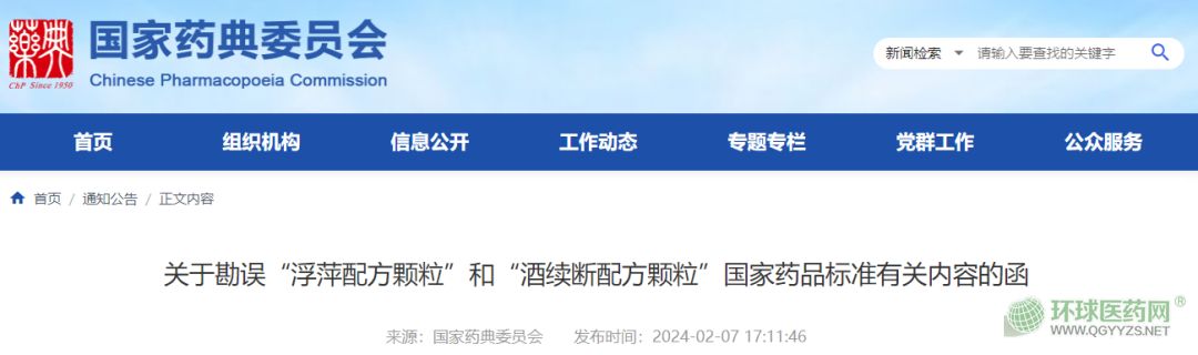 2024年02月07日,國家藥典委發(fā)布了《關(guān)于勘誤“浮萍配方顆粒”和“酒續(xù)斷配方顆!眹宜幤窐(biāo)準(zhǔn)有關(guān)內(nèi)容的函》,對浮萍配方顆粒和酒續(xù)斷配方顆粒標(biāo)準(zhǔn)項下存在錯內(nèi)容進(jìn)行了勘誤修訂。