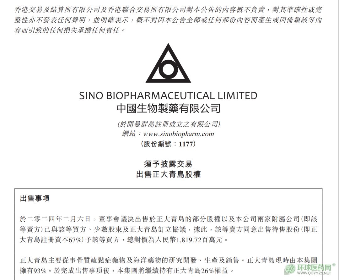 2024年2月6日,中國(guó)生物制藥發(fā)布公告稱,中國(guó)生物制藥將出售正大青島67%股權(quán)給兩位買方,交易總對(duì)價(jià)約為人民幣18.2億元。
