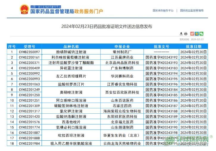 2024年2月23日,國家藥監(jiān)局官網(wǎng)發(fā)布最新藥品批準證明文件。本批共1品種、1品規(guī)藥品補充申請獲批,通過一致性評價;14品種、17品規(guī)藥品獲批上市,視同通過一致性評價。