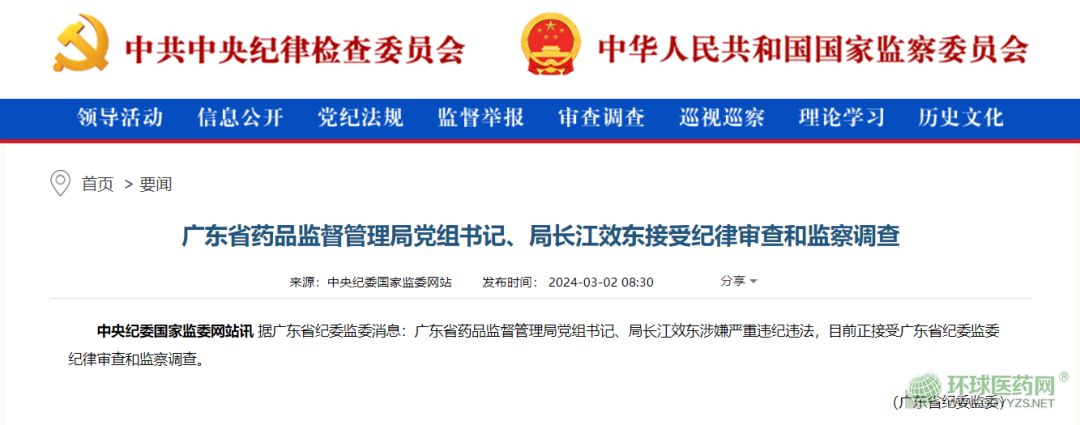近日,中央紀(jì)委國(guó)家監(jiān)委網(wǎng)站發(fā)布通報(bào):廣東省藥品監(jiān)督管理局黨組書記、局長(zhǎng)江效東接受紀(jì)律審查和監(jiān)察調(diào)查。