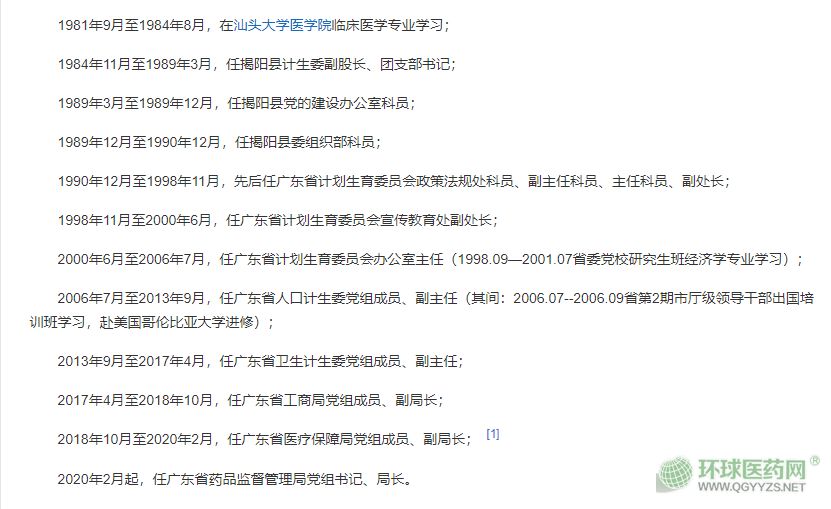 此前,江效東曾在醫(yī)療衛(wèi)生系統(tǒng)長(zhǎng)期工作:2000年6月起任原廣東省計(jì)劃生育委員會(huì)辦公室主任;2006年7月起任原廣東省人口計(jì)生委黨組成員、副主任;2019年9月起任原廣東省衛(wèi)生計(jì)生委黨組成員、副主任;2017年4月,江效東調(diào)至廣東省工商局任黨組成員、副局長(zhǎng);2018年10月起任廣東省醫(yī)療保障局黨組成員、副局長(zhǎng);2020年2月起任廣東省藥品監(jiān)督管理局黨組書記、局長(zhǎng)。