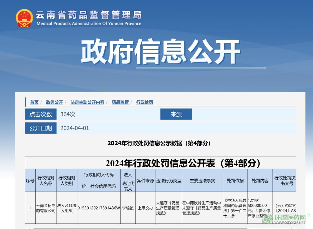 云南金柯制藥有限公司在中藥飲片生產活動中未遵守《藥品生產質量管理規(guī)范》,被罰款50萬元并責令停產停業(yè)整頓。