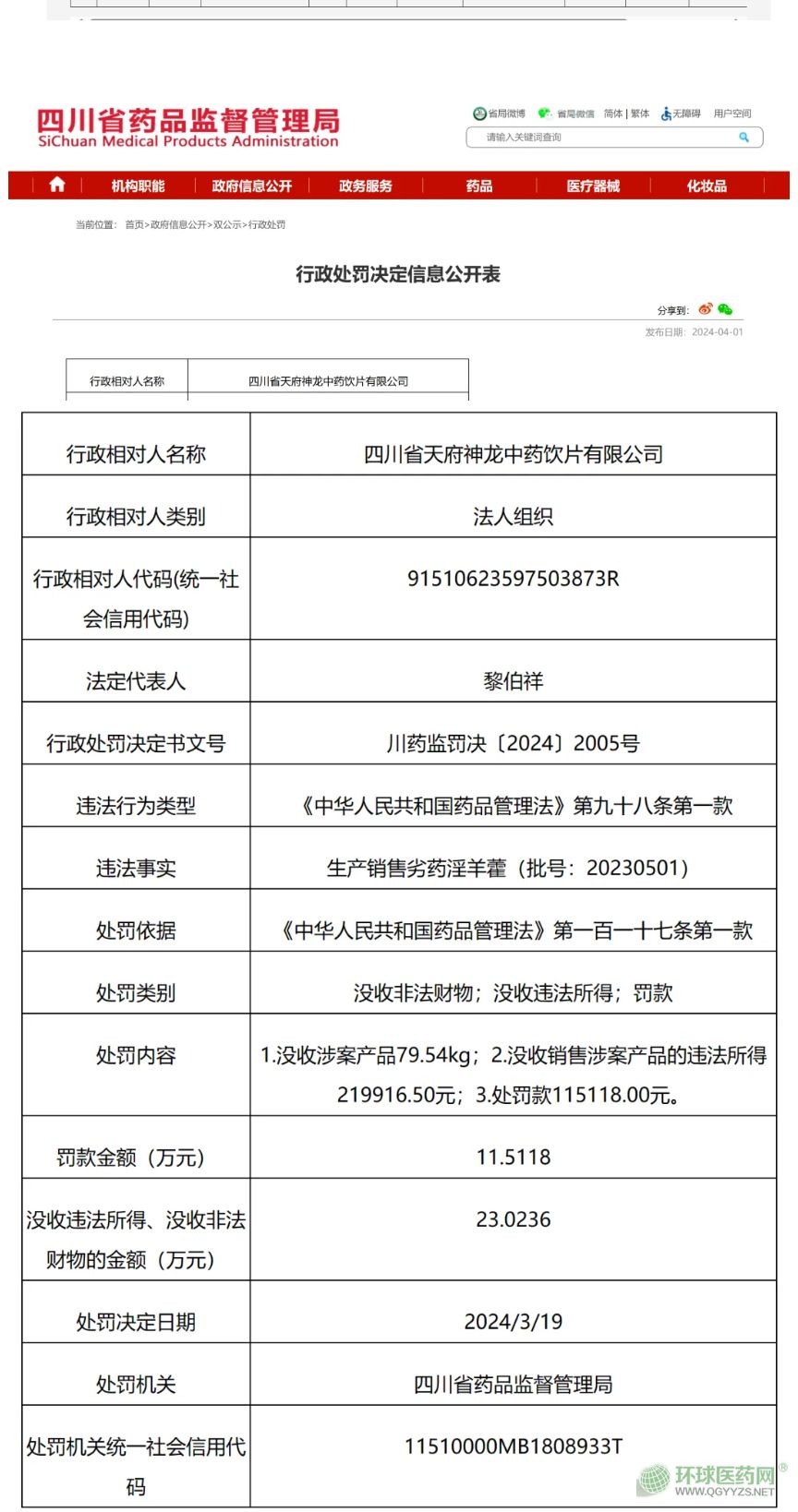 四川省天府神龍中藥飲片有限公司生產銷售劣藥淫羊藿,罰沒合計33.50萬元。