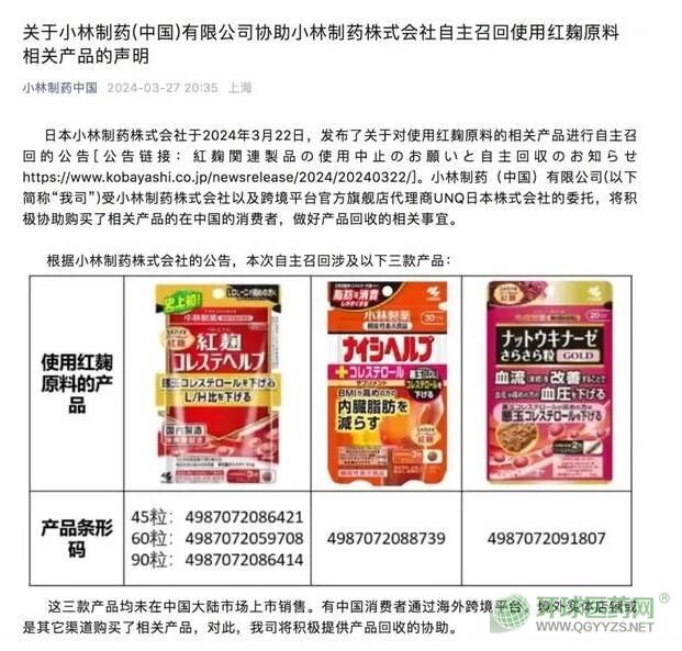 同時(shí),對(duì)于含有日本小林制藥生產(chǎn)的紅麹原料的產(chǎn)品,也屬于日本小林制藥要求的自主召回對(duì)象,因此,小林制藥中國(guó)公司也懇請(qǐng)各位協(xié)助該類產(chǎn)品的召回。