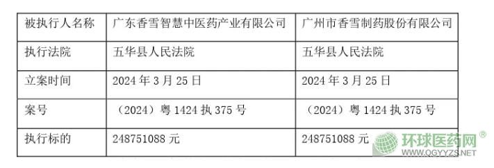 廣東香雪智慧中醫(yī)藥產(chǎn)業(yè)有限公司被五華縣人民法院強(qiáng)制執(zhí)行,案號(hào)(2024)粵1424執(zhí)327號(hào),執(zhí)行標(biāo)的1,626.59萬元;