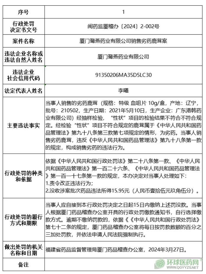 行政處罰決定書(閩藥監(jiān)廈稽辦〔2024〕2-002號(hào))顯示,根據(jù)寧德市市場監(jiān)督管理局移送的線索移送函(寧市監(jiān)函﹝2024﹞3號(hào)),福建省藥品監(jiān)督管理局廈門藥品稽查辦公室依法對(duì)廈門鷺燕藥業(yè)有限公司開展現(xiàn)場核查。