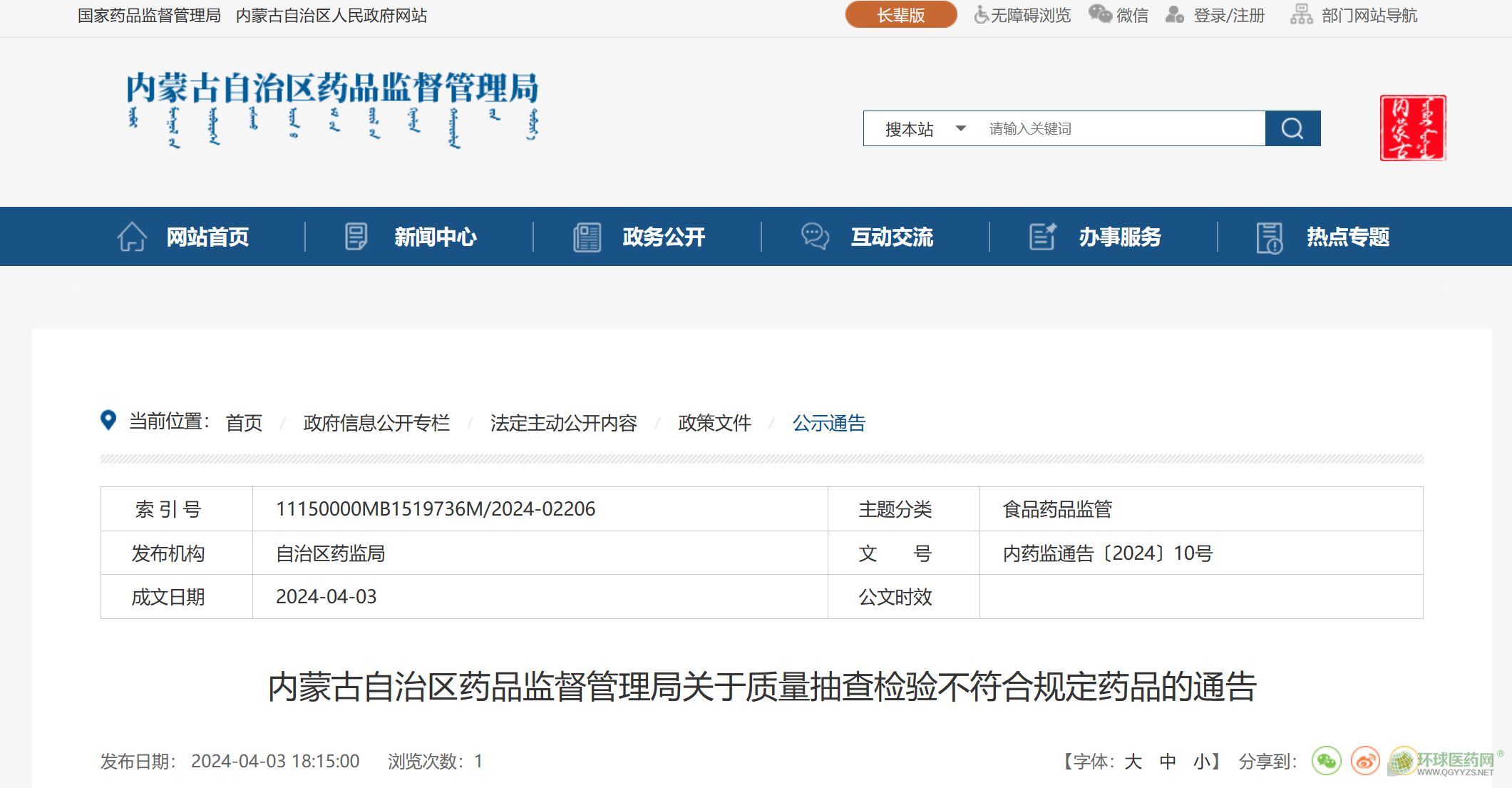 4月3日,內(nèi)蒙古藥監(jiān)局發(fā)布了藥品不合格質(zhì)量公告。