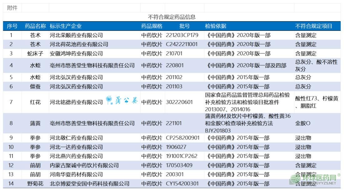 不合格品種:拳參3批次,蒼術(shù)、前胡、水蛭各2批次、紅花、僵蠶、蒲黃、蛇床子、野菊花各1批次。