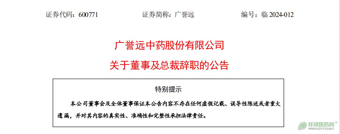 4月10日廣譽(yù)遠(yuǎn)發(fā)布公告,現(xiàn)任總裁苗輝和原董事長(zhǎng)張斌同日辭職。