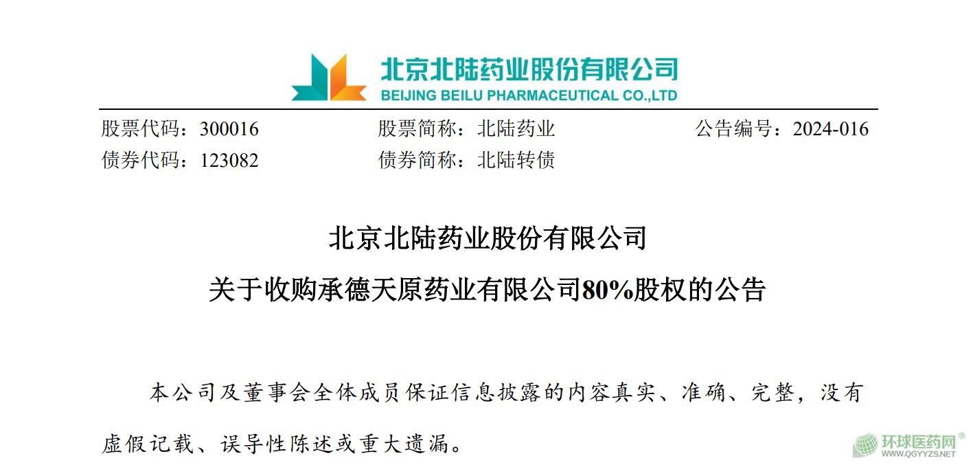 北陸藥業(yè)2.02億元收購天原藥業(yè)80%股份