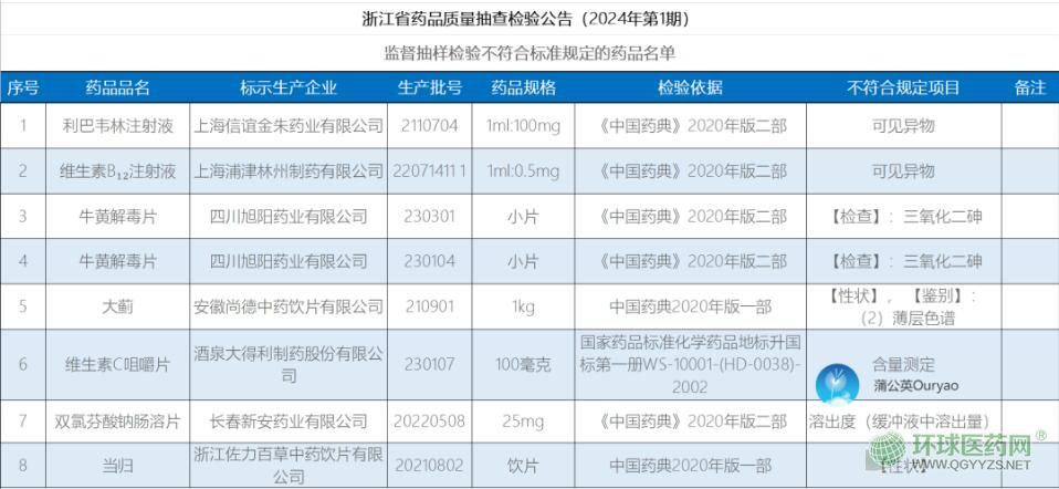 不合格藥品和檢測項(xiàng)目:利巴韋林注射液(可見異物)、維生素B₁₂注射液(可見異物)、牛黃解毒片(檢查:三氧化二砷)、大薊( 性狀, 鑒別:(2)薄層色譜)、維生素C咀嚼片(含量測定)、雙氯芬酸鈉腸溶片(溶出度(緩沖液中溶出量)) 、當(dāng)歸(性狀)。
