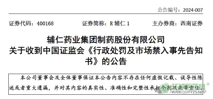 5 月 31 日,輔仁藥業(yè)集團制藥股份有限公司發(fā)布關于收到中國證監(jiān)會《行政處罰及市場禁入事先告知書》的公告,表示近日已收到中國證監(jiān)會下發(fā)的《行政處罰及市場禁入事先告知書》(編號:處罰字[2024]49號)。