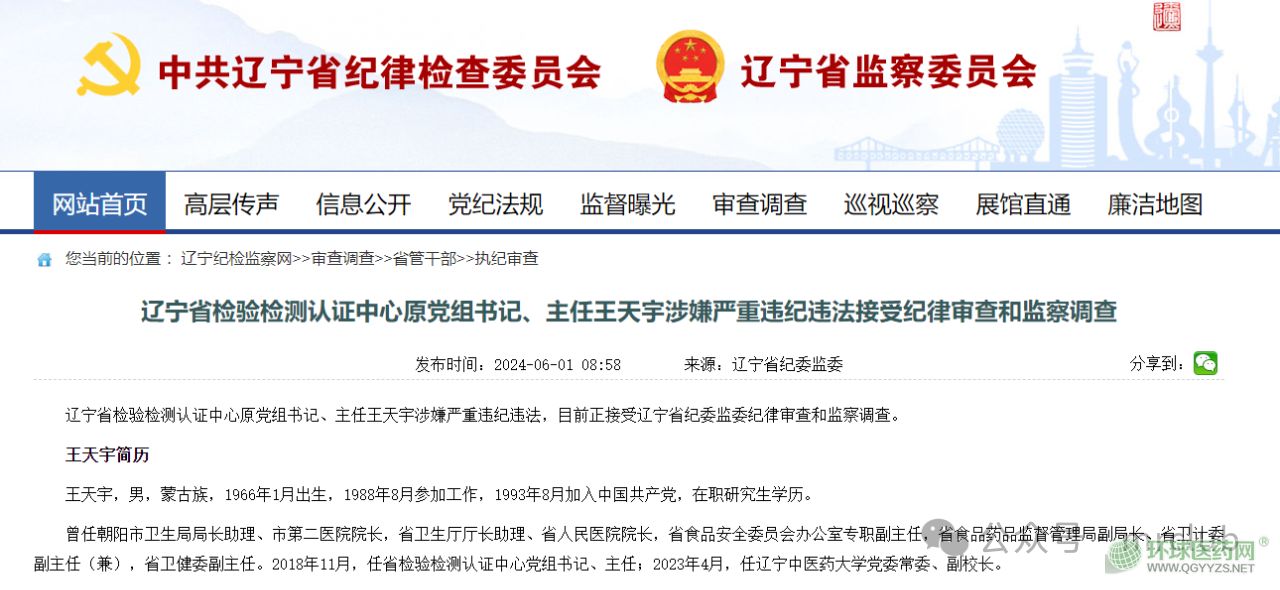 6 月 1 日,據(jù)遼寧省紀(jì)檢監(jiān)察網(wǎng),遼寧省檢驗(yàn)檢測(cè)認(rèn)證中心原黨組書(shū)記、主任王天宇涉嫌嚴(yán)重違紀(jì)違法,目前正接受遼寧省紀(jì)委監(jiān)委紀(jì)律審查和監(jiān)察調(diào)查。