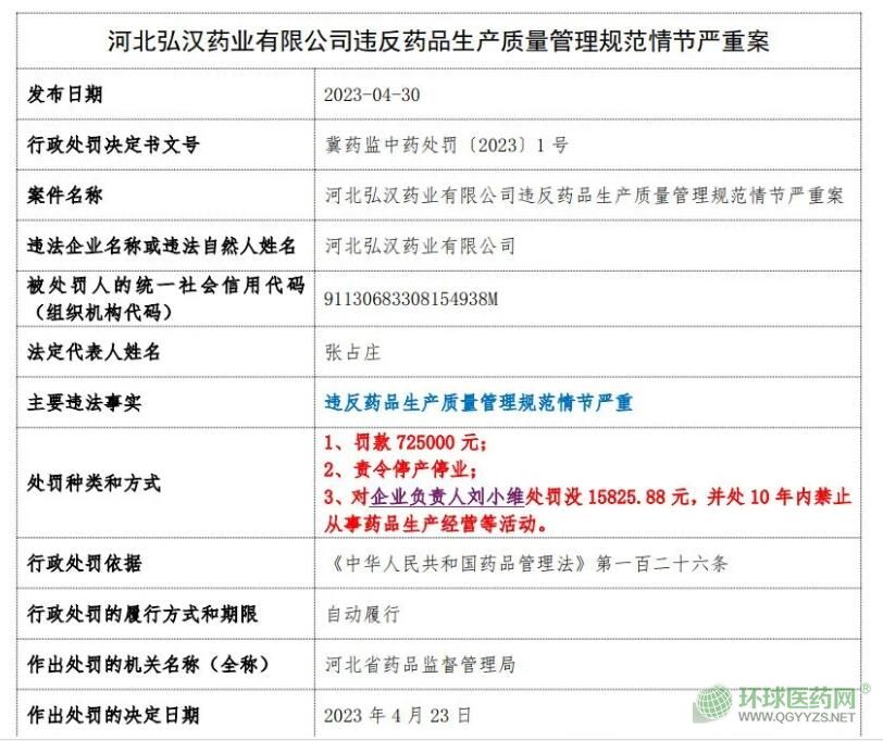 同時(shí),在河北省藥監(jiān)局網(wǎng)站搜索“弘漢藥業(yè)”,發(fā)現(xiàn)在2023年04月30日還有一則對(duì)該企業(yè)的處罰,罰款72.5萬(wàn)元、責(zé)令停產(chǎn)停業(yè)、企業(yè)負(fù)責(zé)人罰款1.58萬(wàn)元+10年禁業(yè)。