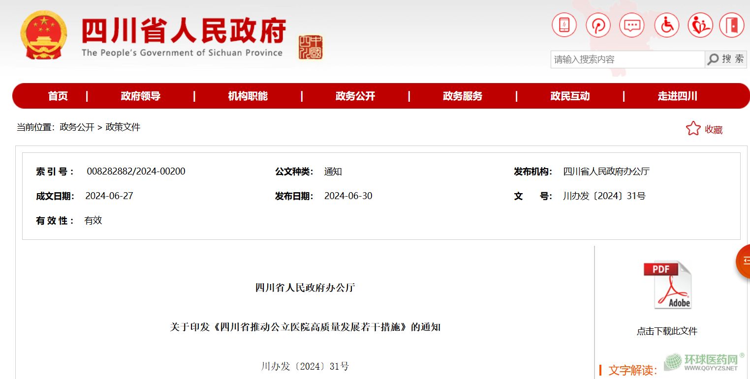 6月30日,四川省人民政府辦公廳印發(fā)《四川省推動公立醫(yī)院高質(zhì)量發(fā)展若干措施》(簡稱《措施》),提出落實(shí)各級政府辦醫(yī)管醫(yī)責(zé)任、完善醫(yī)院內(nèi)部管理體系和機(jī)制、加快推進(jìn)醫(yī)療服務(wù)價(jià)格改革、深化人事和薪酬制度改革等10項(xiàng)措施。