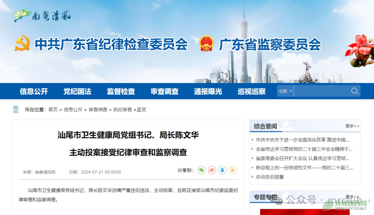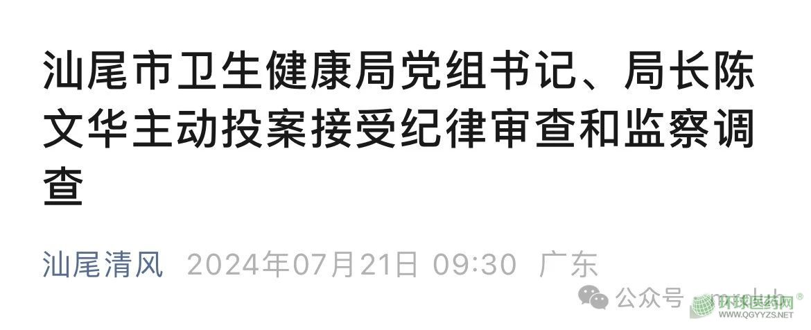 7 月 21 日),據(jù)廣東紀(jì)檢監(jiān)察網(wǎng)“南粵清風(fēng)”公告,汕尾市衛(wèi)生健康局黨組書(shū)記、局長(zhǎng)陳文華涉嫌嚴(yán)重違紀(jì)違法,主動(dòng)投案,目前正接受汕尾市紀(jì)委監(jiān)委紀(jì)律審查和監(jiān)察調(diào)查。