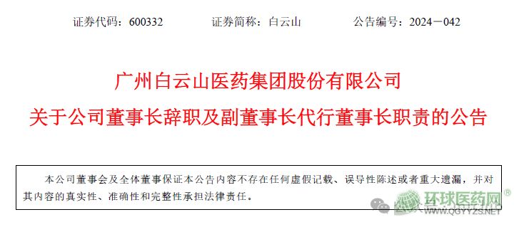 據(jù)這份發(fā)布于上海證券交易所的《廣州白云山醫(yī)藥集團(tuán)股份有限公司關(guān)于公司董事長(zhǎng)辭職及副董事長(zhǎng)代行董事長(zhǎng)職責(zé)的公告 》顯示,廣州白云山醫(yī)藥集團(tuán)股份有限公司董事會(huì)于 2024 年 7 月 22 日收到公司董事長(zhǎng)李楚源遞交的書(shū)面辭職報(bào)告,因個(gè)人原因,李楚源辭去公司第九屆董事會(huì)董事長(zhǎng)、執(zhí)行董事及董事會(huì)戰(zhàn)略發(fā)展與投資委員會(huì)主任的職務(wù)。