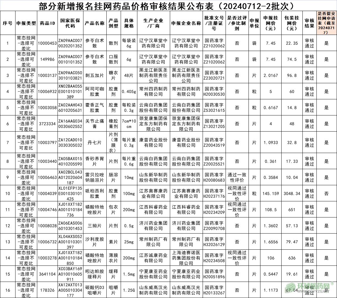 根據(jù)梳理,《關(guān)于公布部分新增報(bào)名掛網(wǎng)藥品價(jià)格審核結(jié)果的通知(20240712-2批次)》公布了16個(gè)新增報(bào)名掛網(wǎng)藥品的價(jià)格審核結(jié)果,涉及參苓白術(shù)散等14個(gè)品種和云南白藥集團(tuán)股份有限公司等14家生產(chǎn)企業(yè)、遼寧漢草堂中藥有限公司等14家申報(bào)企業(yè)。