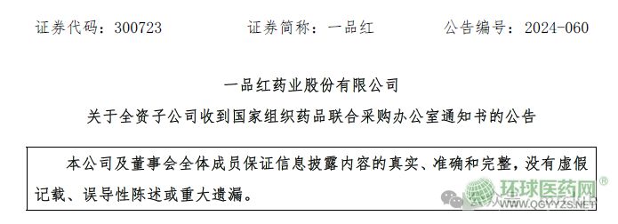 7 月 27 日,一品紅藥業(yè)股份有限公司發(fā)布《關(guān)于全資子公司收到國家組織藥品聯(lián)合采購辦公室通知書的公告》。