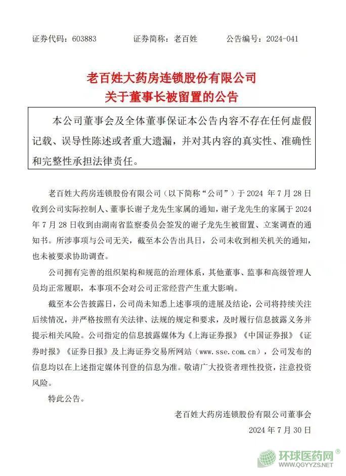 7月30日,老百姓大藥房發(fā)布公告稱收到公司實(shí)際控制人、董事長謝子龍家屬的通知,謝子龍的家屬于7月28日收到由湖南省監(jiān)察委員會(huì)簽發(fā)的謝子龍被留置、立案調(diào)查的通知書。所涉事項(xiàng)與公司無關(guān),截至公告出具日,公司未收到相關(guān)機(jī)關(guān)的通知,也未被要求協(xié)助調(diào)查。