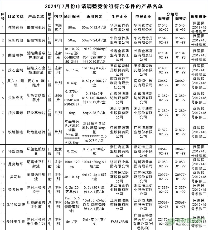 根據(jù)梳理,2024年7月份申請(qǐng)調(diào)整競(jìng)價(jià)組符合條件的產(chǎn)品合計(jì)14個(gè),共涉及13個(gè)品種和11家生產(chǎn)企業(yè)。具體包括: