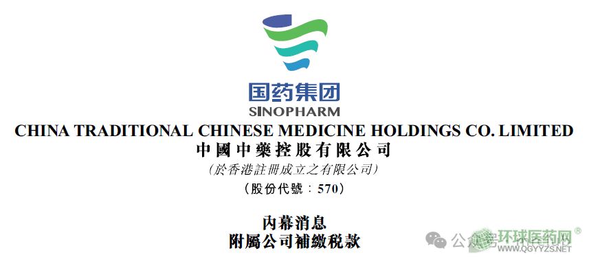 8 月 21 日,中國中藥控股有限公司于港交所發(fā)布“內(nèi)幕消息-附屬公司補(bǔ)繳稅款”公告,就補(bǔ)稅事宜向股東及潛在投資者做出說明,需要補(bǔ)繳稅款約 1.5 億元。